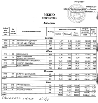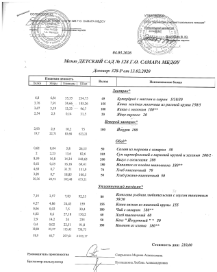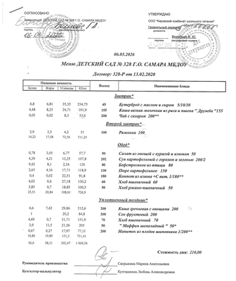 Питание в МБДОУ «Детский сад № 328» г. о. Самара организовано в соответствии с примерным меню, утвержденным руководителем бюджетного учреждения, рассчитанным на 2 недели, с учетом физиологических потребностей в энергии и пищевых веществ для детей всех возрастных групп и рекомендуемых суточных наборов продуктов. В случае медицинских показаний воспитанника, по заявлению родителей (законного представителя) может быть представлено индивидуальное питание Питание детей включает: завтрак, второй завтрак (напиток или сок и (или свежие фрукты), обед, полдник, ужин. Осуществляется в групповых комнатах каждой возрастной группы. Время приёма пищи определяется в каждой группе в зависимости от возраста детей. Производство блюд осуществляется на пищеблоке МБДОУ «Детский сад № 328» г. о. Самара