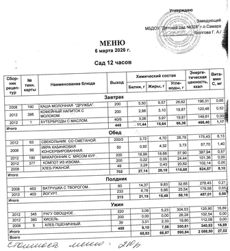 Питание в ДОУ осуществляется на основе утверждённого десятидневного меню. Предлагаемое десятидневное меню согласовано с заведующим, поваром и старшей медицинской сестрой.