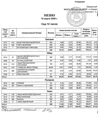 Детский сад работает по утвержденному 10-дневному меню, с учетом рекомендуемых среднесуточных норм питания.