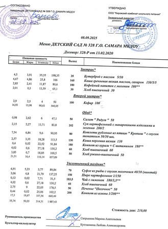 Меню содержит информацию о количественном составе основных пищевых веществ и энергии (белков, жиров, углеводов) по каждому блюду, приему пищи, за каждый день и в целом за период его реализации.